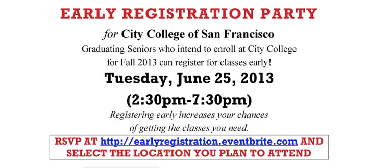 Graduating seniors who intend to enroll at City College for Fall 2013 can register for classes early! Bridge to Success is sponsoring Early Registration Parties at five locations to help students register for fall classes and answer their questions.